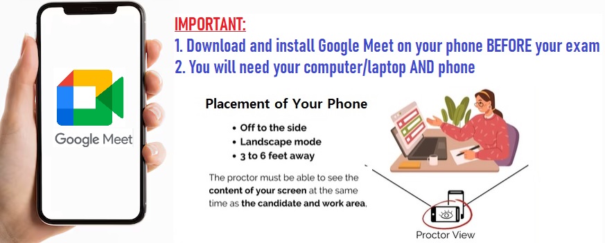 • Your mobile phone will be used as a 2nd camera for the exam.  Make sure you have enough BATTERY on both your computer and phone.